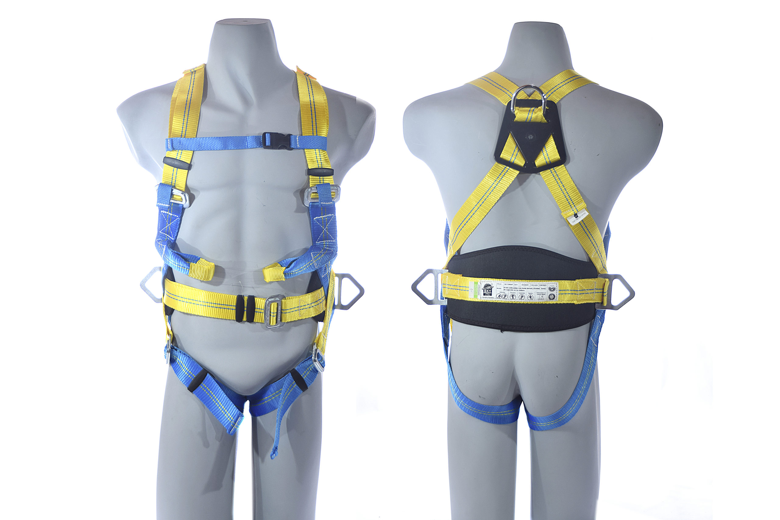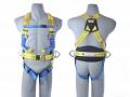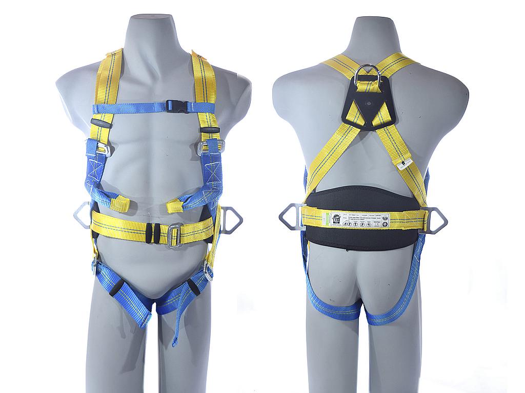 Arnés completo tipo paracaidista. Bandas poliéster alta tenacidad. Toma anticaídas dorsal y frontal. Dos argollas de sujeción en la cintura. Protector lumbar acolchado forrado ancho 200mm. Hebillas de regule en hombros y piernas. Sello conformidad Norma IRAM 3622-1.