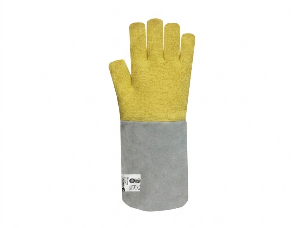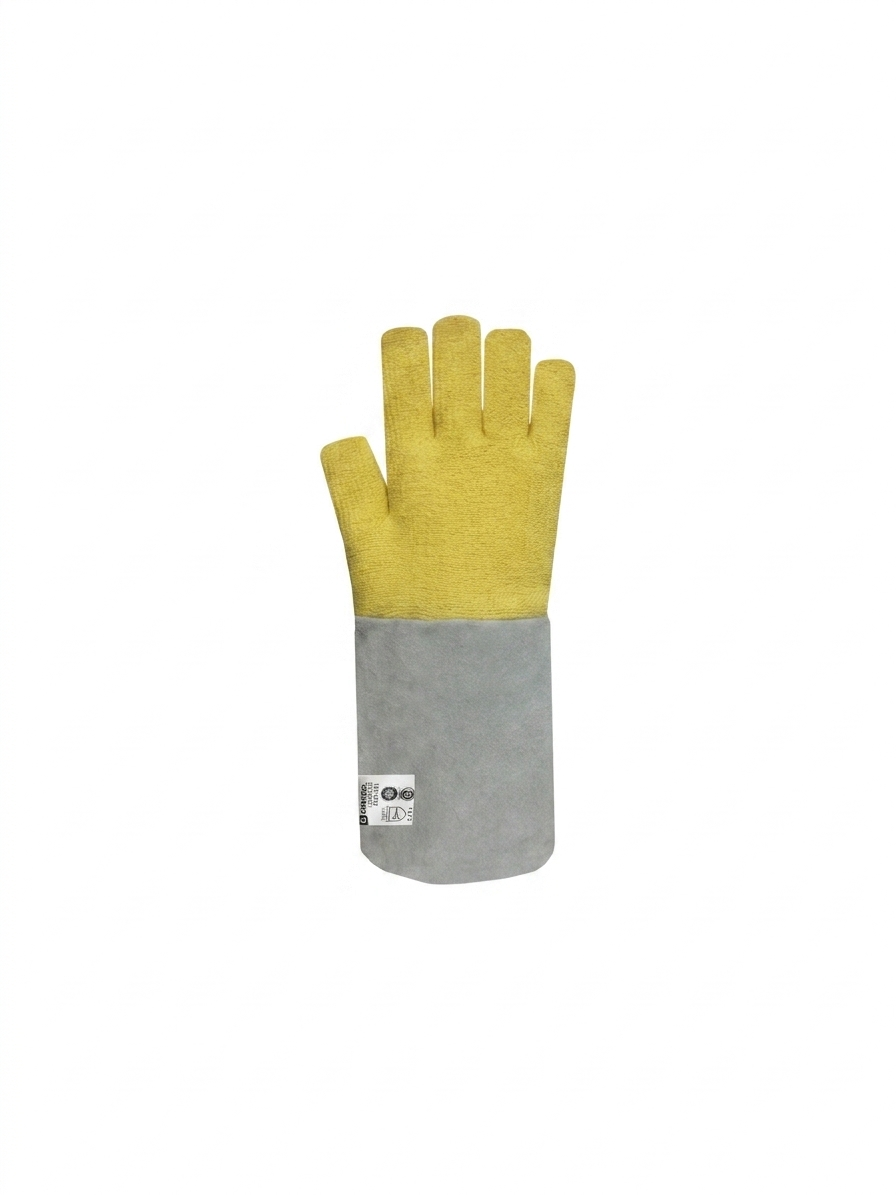 Guante tejido en Terrycloth con hilo de Aramida, forro de algodón, siendo un excelente aislante térmico gracias al tejido de algodón. Este guante posee un puño de cuero de DESCARNE abierto, lo que permite una rápida extracción del guante a un bajo costo. Diseñado para la manipulación intermitente de objetos a temperaturas de entre 180ºC a 230ºC.