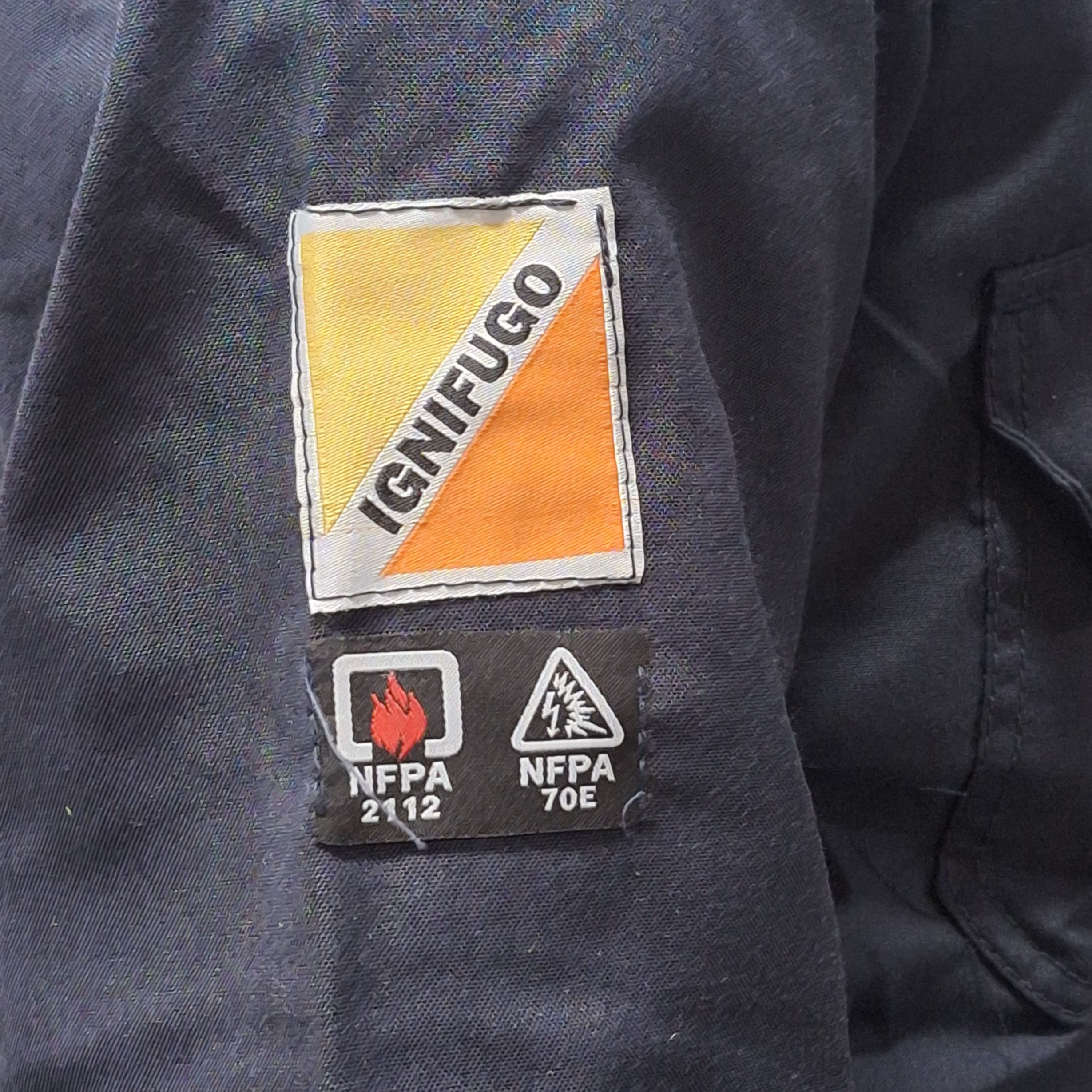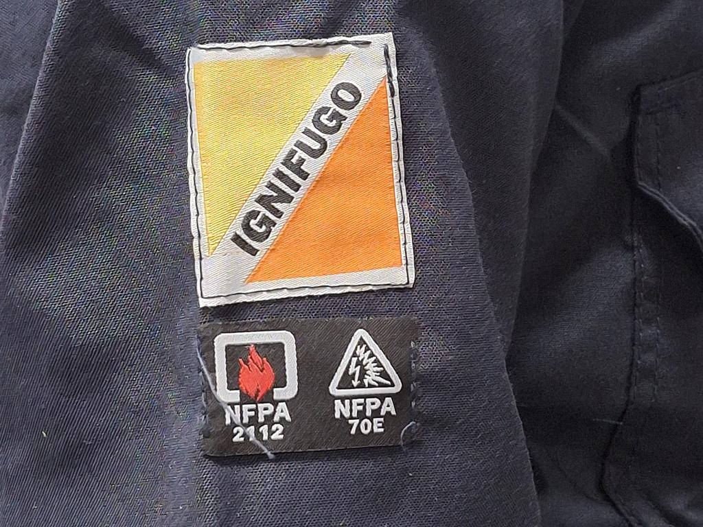Confeccionado en tela FLAMARMOR y bandas reflectivas. Etiqueta de “ignifugo” y “NFPA 2112” en brazo izquierdo.